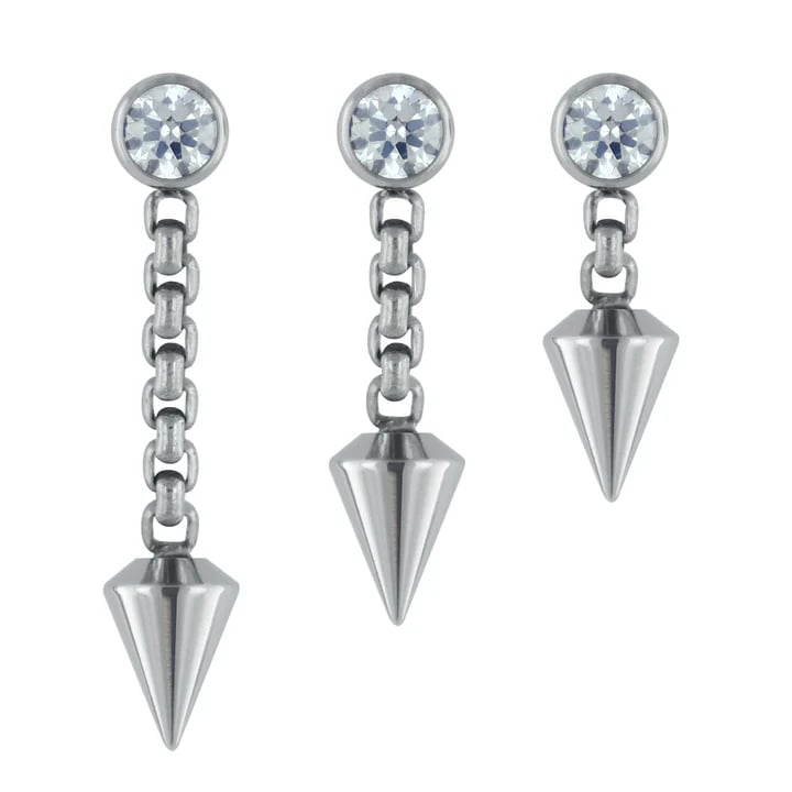 These stunning pieces feature a 3mm bezel set gem with a 4mm spear dangle, available in 1/8”, 1/4”, and 3/8” lengths.